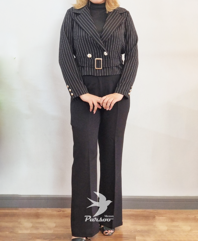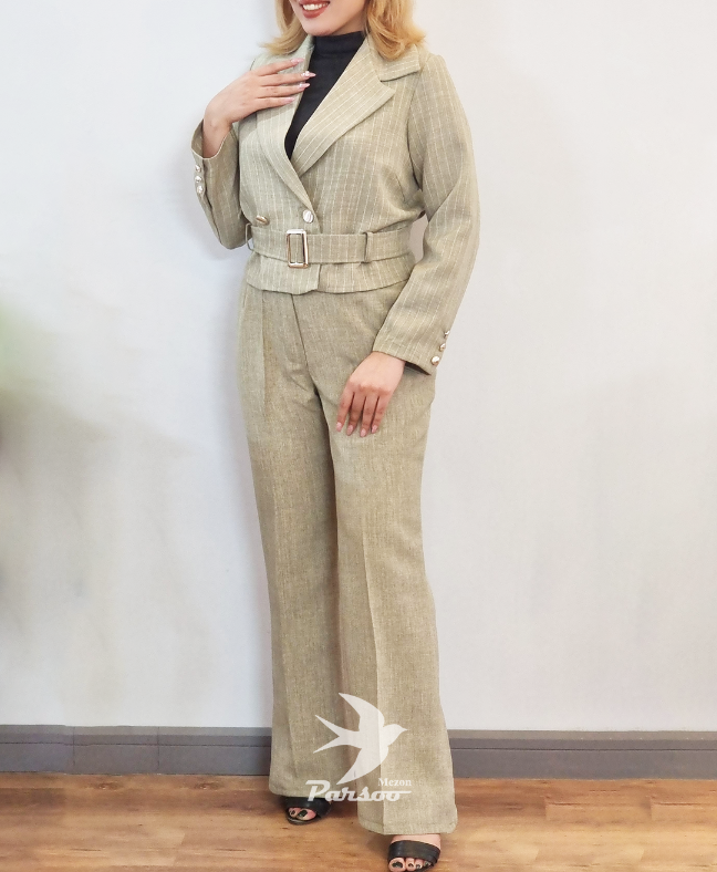کت و شلوار زنانه شانتون دیپلمات لمه – کت کراپ کمردار سگکدار و شلوار سایزبندی ۳۸ تا ۴۶