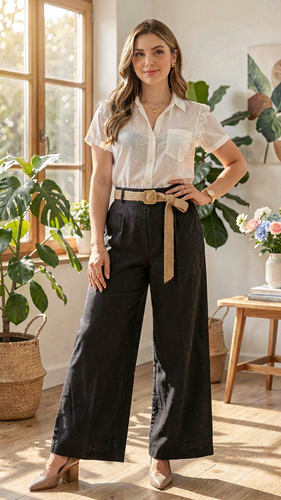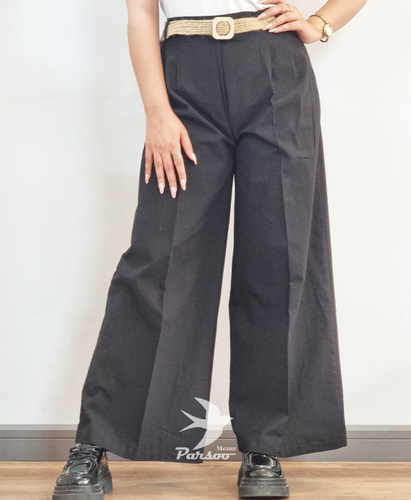 شلوار زنانه فول بگ لینن تابستانی مشکی– فری سایز ۳۸ تا ۴۴ با کمربند شیک، سبک و خنک