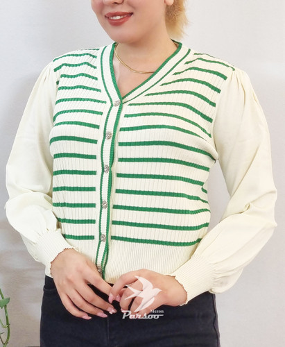 بلوز بافت زنانه فریسایز جلو دکمه – آستین بلند، یقه هفت، راهراه، تک رنگ